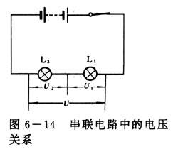 按照图6-14所示电路图连接成串联电路,用电压表分别测出:灯泡L1两端的电压U1,灯泡L2两端的电压U2,L1与L2串联后的总电压U,记下测量结果.回答:串联电路两面端的总电压跟各部分电路两端的电压之和有什么关系?